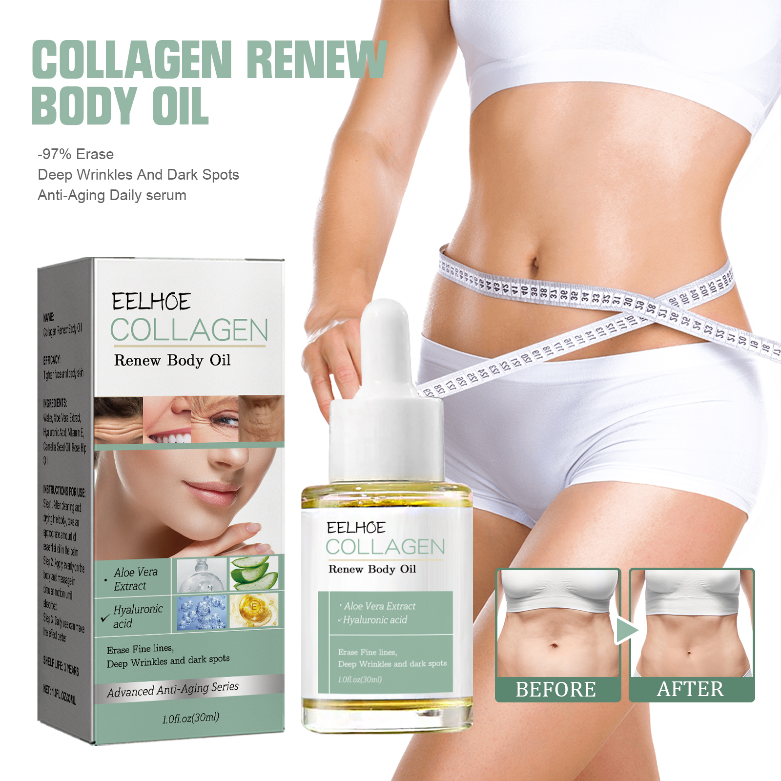 Our collagen body essence oil contains aloe vera extract, hyaluronic acid, and vitamin E. It helps maintain skin stability, repairs and protects against oxidation, promotes collagen regeneration, and brightens and firms the skin. It's easy to use: 1. After cleansing and drying your body, take an appropriate amount of oil into your palm; 2. Apply evenly to your entire body and massage in a circular motion until absorbed; 3. Regular use will yield better results. This collagen body essence oil reduces wrinkles and firms the skin, moisturizes, beautifies the skin, and improves dullness, roughness, and fine lines.