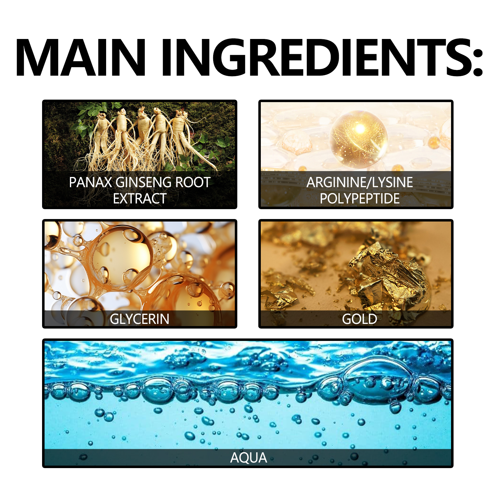 Our Ginseng Gold Peptide Anti-Wrinkle Serum contains glycerin, ginseng root extract, and gold. It nourishes the skin, provides long-lasting hydration, leaving skin soft and supple, improves dull complexion, and makes skin tone more even and radiant. It's easy to use: after cleansing and drying your face, apply 3-4 drops of the serum to your face, wait for about 10 minutes, and then rinse with water. Long-term use can improve skin texture, delay skin aging, and maintain healthy and beautiful skin. The formula is gentle and suitable for all skin types, including sensitive skin.
