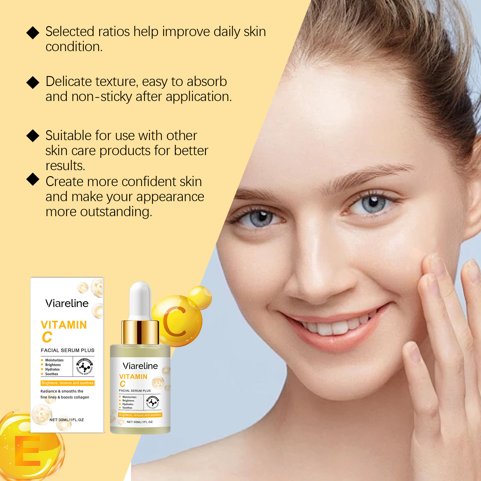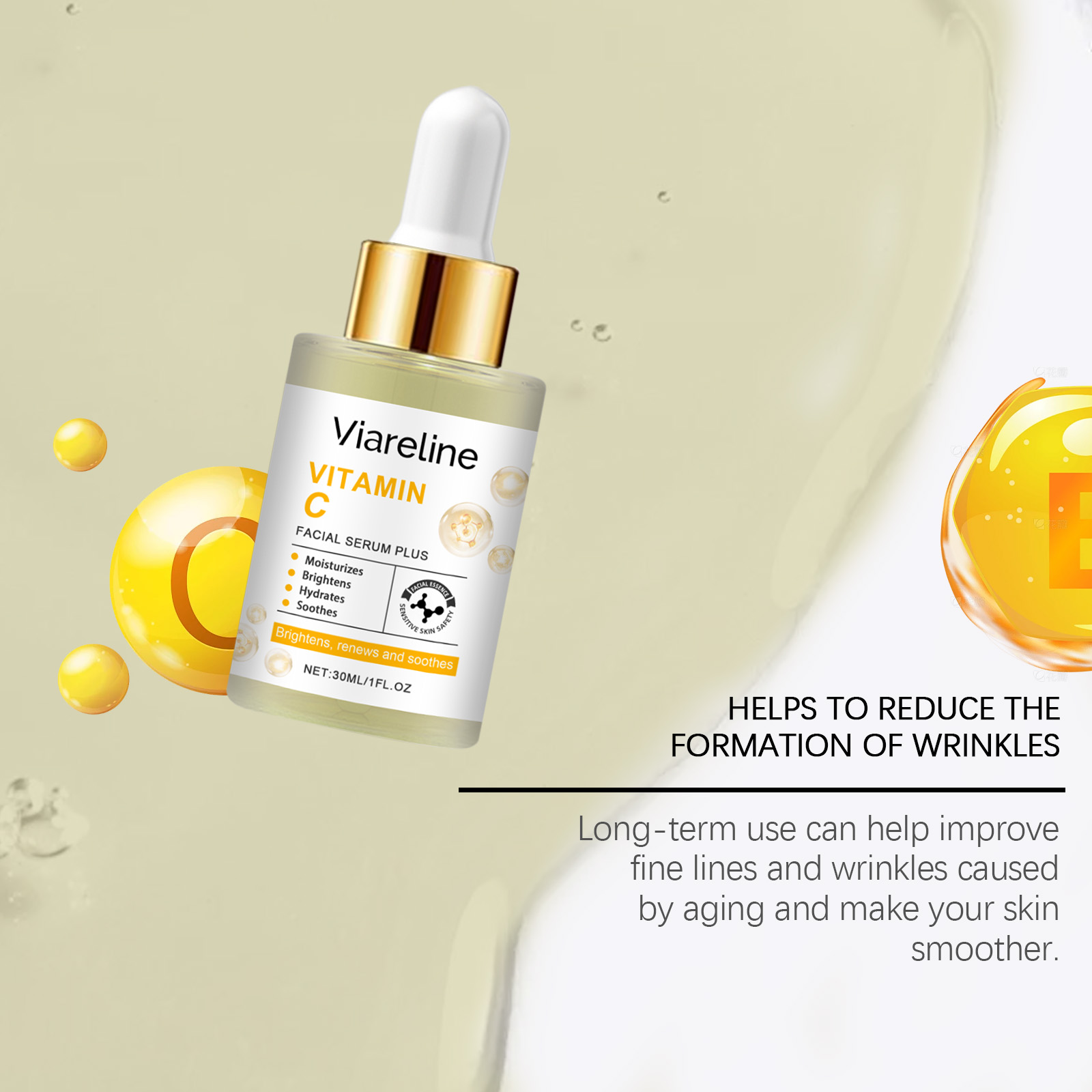 Our Vitamin C Moisturizing Facial Serum contains glycerin and hydroxyethylcellulose. It targets fine lines and wrinkles, improving skin texture and overall appearance. It helps improve skin elasticity and reduce sagging. It's easy to use: Cleanse and dry your face. Apply an appropriate amount of the serum evenly to your face. Gently massage until absorbed. It helps reduce the appearance of fine lines and leaves your skin looking firmer and smoother.